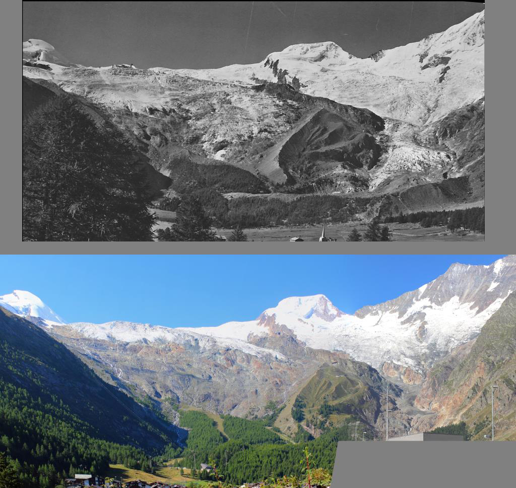1958 war ich als 10-jähriger Bube mit der Familie in Saas-Fee. In 2013 (55 Jahre später) kam ich zurück. Vergleichen Sie die Gletscher: Die Erderwärmung vollzieht sich! Links auf dem Bild sieht man die weisse Schneekuppe des Allalinhorns.