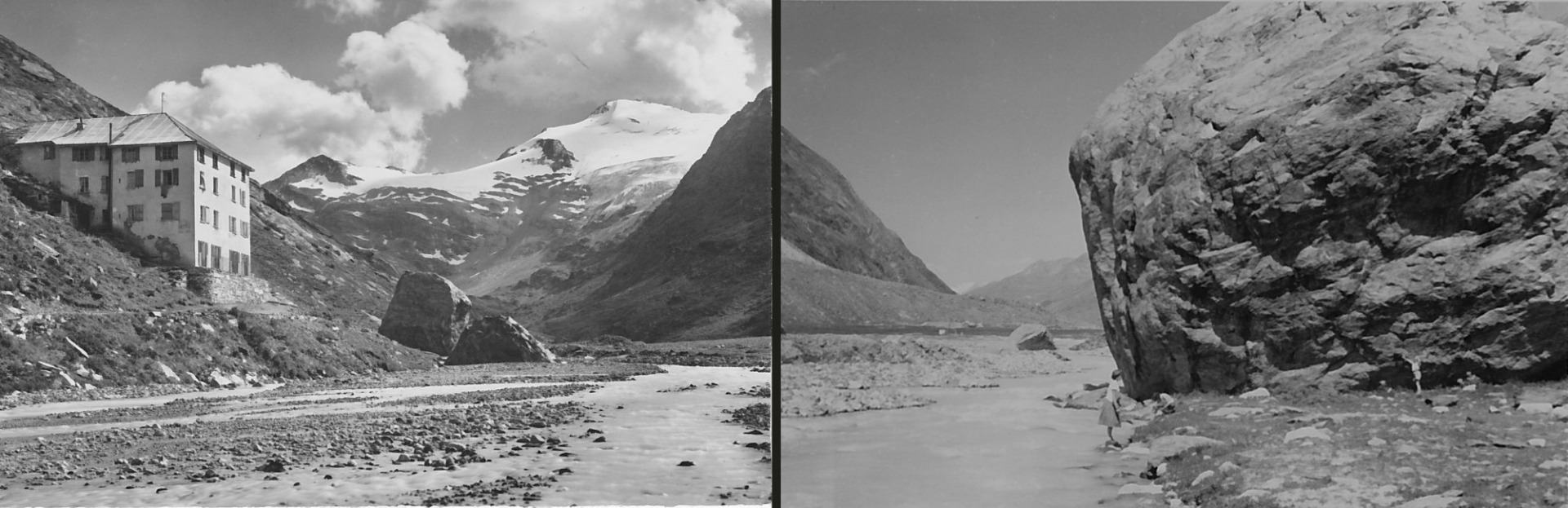 1958 machten wir Touren und übernachteten im Hotel Mattmark. Meine zwei Schwester sind am Wasser, ich stehe vor dem gewaltigen "blauen Stein". Warum der so hiess, weiss ich nicht mehr und jetzt ist nichts mehr davon zu sehen - nächstes Bild