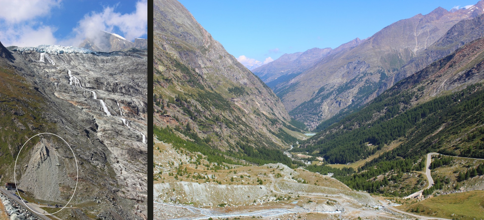 (links) Mattmarkrestaurant mit Schuttkegel und die apere Allalingletscher. Zuoberst eine Eiswand des Gletschers. Immer mal wieder können Eisbrocken abbrechen, ganz ungefährlich scheint mir das Gelände rechts des Schuttkegels nicht. Aber dort (Bild rechts), wo die Strasse hierhin hochführt, ist ein Schuttgelände mit wunderschönen Steinen (Serpentinite, Granat-Glimmerschiefer, Eklogite und natürlich Allalin-Gabbros.