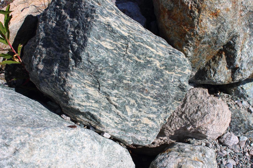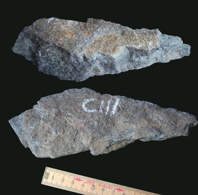 Die folgenden Steine sind richtige Gabbros. Vergleichen Sie hier die schwarzen Bestandteile mit jenen von Amphibolit, dann wird klar, dass Pyroxen nicht dieselbe Schwärze besitzt wie Amphibol.