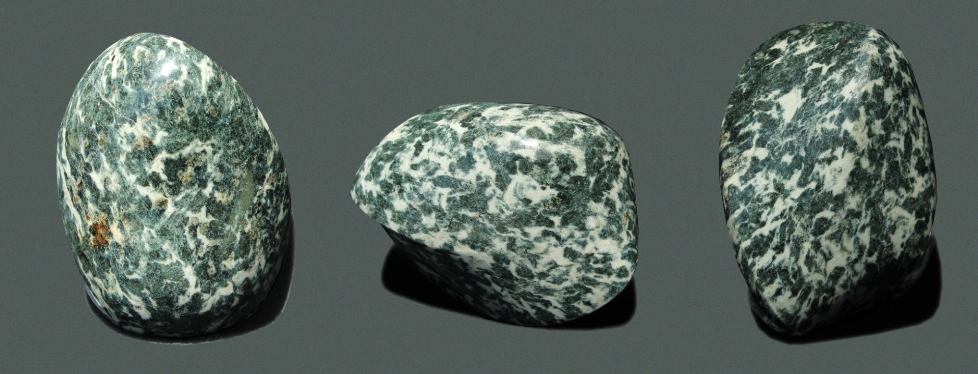 Als ich alle diese Steine miteinander vergleiche, ist eine Aufteilung von dunklen und weisslichen Stellen in einer gewissen Einregelung zu erkennen. Doch sind sie recht unterschiedlich. Der Erste hat kräftige weissliche Stellen fast so viele wie es dunkle Stellen gibt, bei dem Zweiten sind die weisse Stellen zu "Pünktchen" geworden und bei der Dritte ist ein fliessendes und im Fluss erstarrtes Muster entstanden.