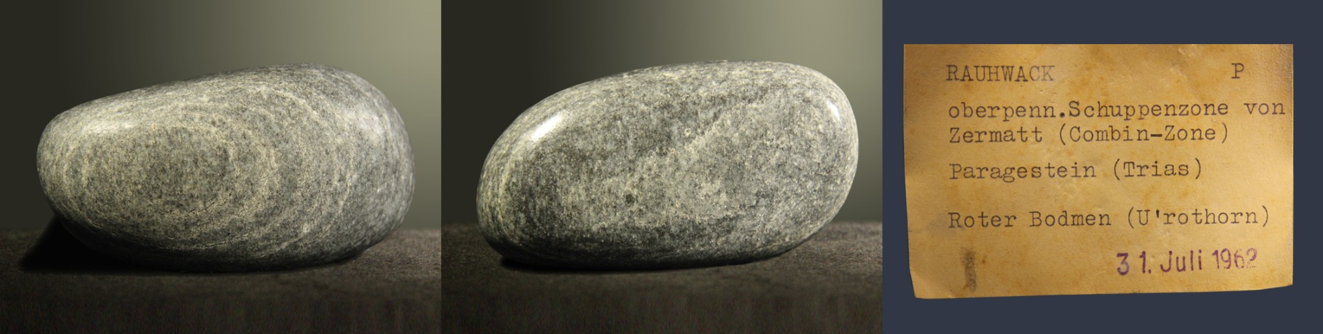 Rauwacke, Zermatt, Nr. 921, Grösse: 65 x35 x 20 mm, Preis: CHF 15.- (von einem Geologieprofessor der Uni Bern, gefunden 31. Juli 1962)