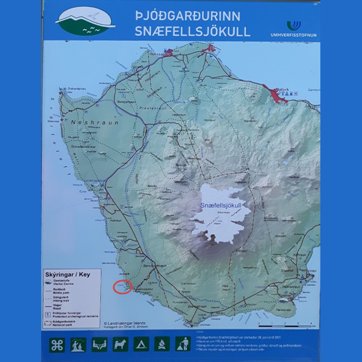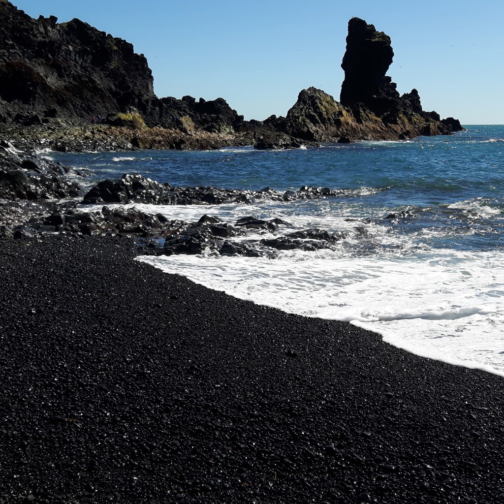 Island: Küste von Snaefellsjökull bei Dritvik (roter Kreis) besteht der Strand aus lauter Andesit Steinen, zuhause habe ich einige geschliffen.