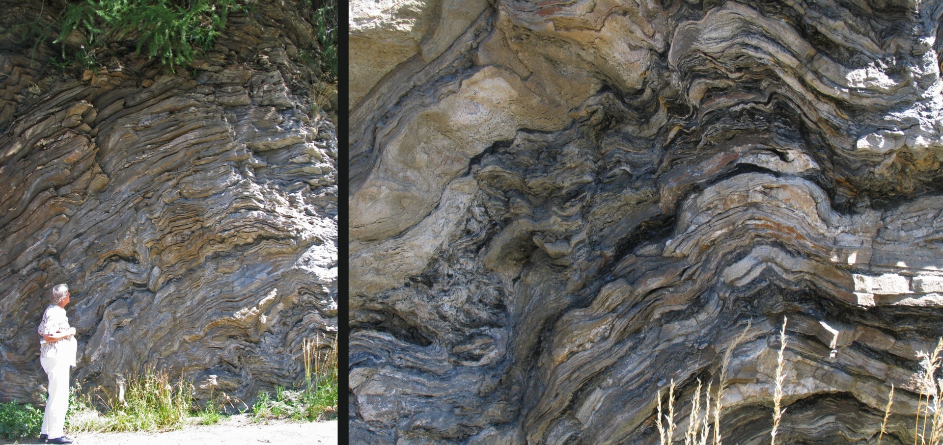 Schiefer hat sich in grossen Tiefen der Erde gebildet bei hohen Temperaturen und Druck. Die Gesteinsmasse wurde hier dickflüssig (duktil) und formbar. Wir realisieren uns oft nicht, dass in diesen Tiefen sich solche Prozesse aktuell auch abspielen. Was wir an der Erdoberfläche vorfinden, ist ein erstarrtes Bild für diese Prozesse. Unvorstellbar ist die Tatsache, dass auch dieses Gestein aus kilometertiefen Schichten an die Oberfläche kam, weil die Erdkruste beständig hochgetrieben und die oberen Schichten durch Erosion abgetragen wurden. Kilometer dicke Schichten "verschwanden" als Geröll.