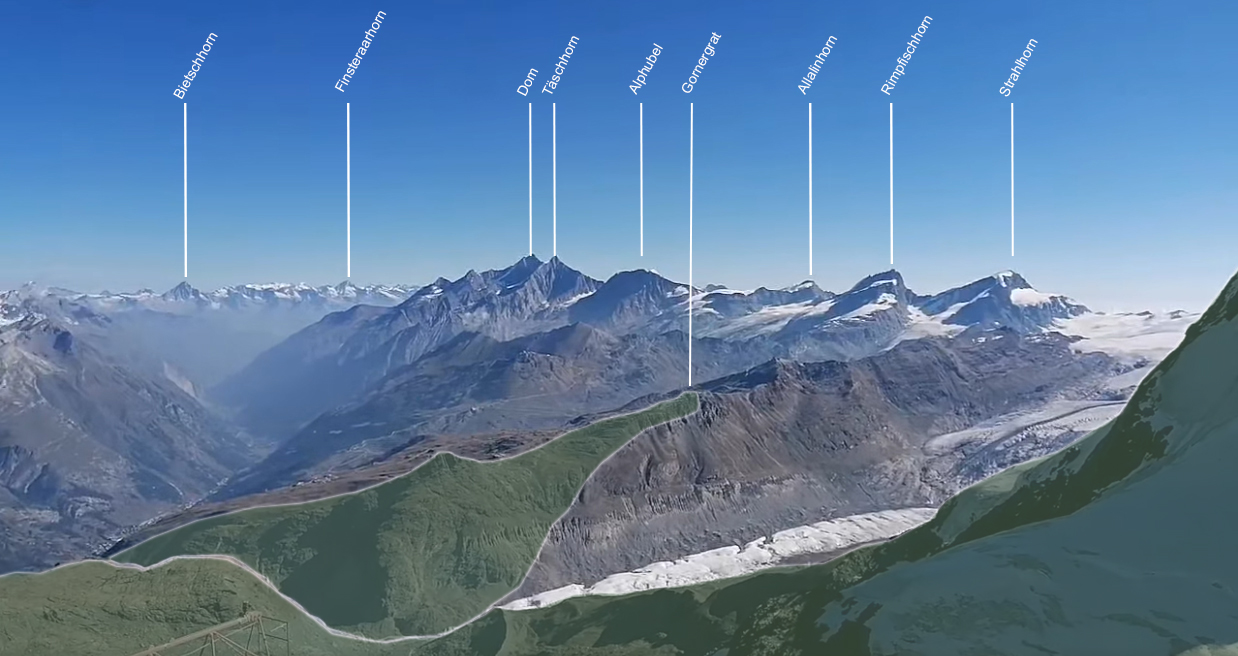 Wenn man auf dem Gornergrat steht und nach Süden blickt, steht man einigen Viertausendern gegenüber ( von links nach rechts: Monte Rosa, Liskamm, Castor und Pollux, Breithorn, Klein-Matterhorn). Es machte auf mich einen tiefen Eindruck, als ich zur Kenntnis nehmen musste, dass hier der Serpentinit bis über 4000 Meter hoch gedruckt worden ist (Ozeanbodengestein auf über 4000 Meter, das ist gewaltig)!